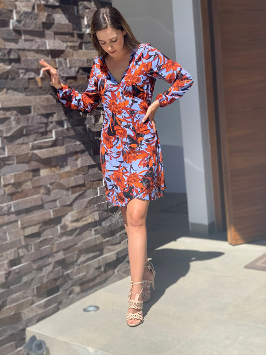 Vestido de maternidad Natalia, azul flores naranjas