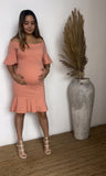 Vestido corto de hombros descubiertos, con tela holgada en cada manga para dar un estilo único y muy dulce.