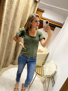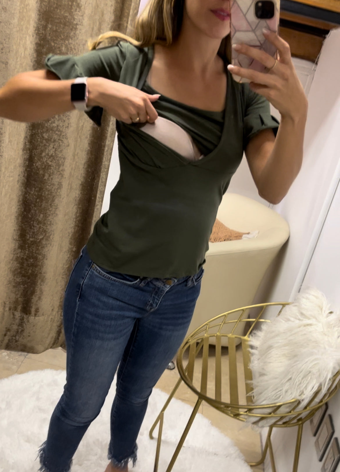 Blusa discreta manga corta elaborada en tela ligera y fresca, cuenta con dos aberturas a los costados en la zona del pecho para mover la tela fácilmente y amamantar a tu bebe.