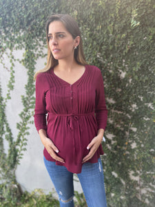 Blusa manga larga en tela ligera y fresca, con listón bajo el pecho para ajustar al cuerpo.