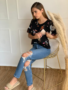 Blusa discreta manga corta elaborada en tela ligera y fresca, cuenta con dos aberturas a los costados en la zona del pecho para mover la tela fácilmente y amamantar a tu bebe.