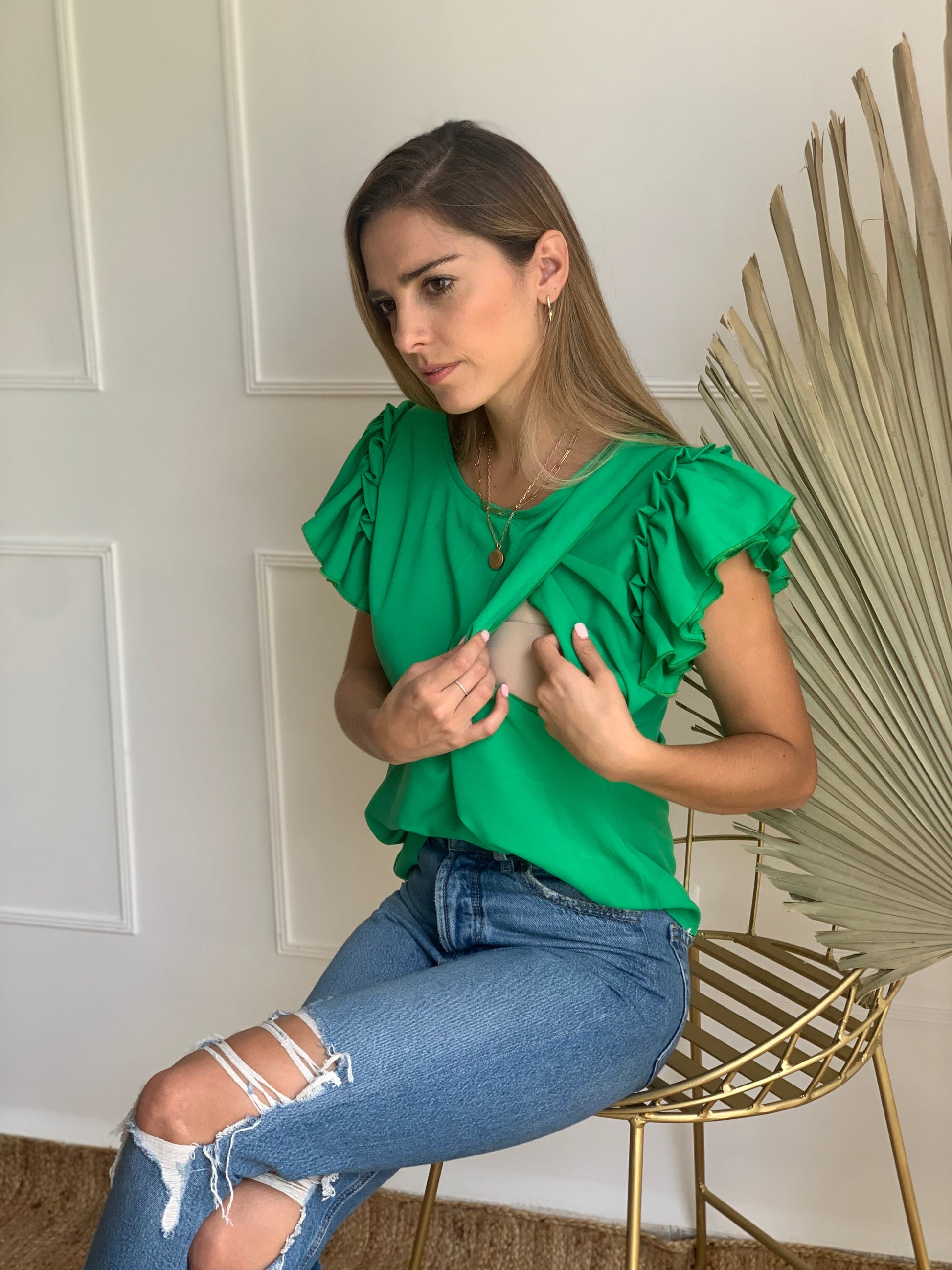 Blusa elaborada en tela ligera, cuenta con dos aberturas a los costados en la zona del pecho para mover la tela fácilmente y amamantar a tu bebe.