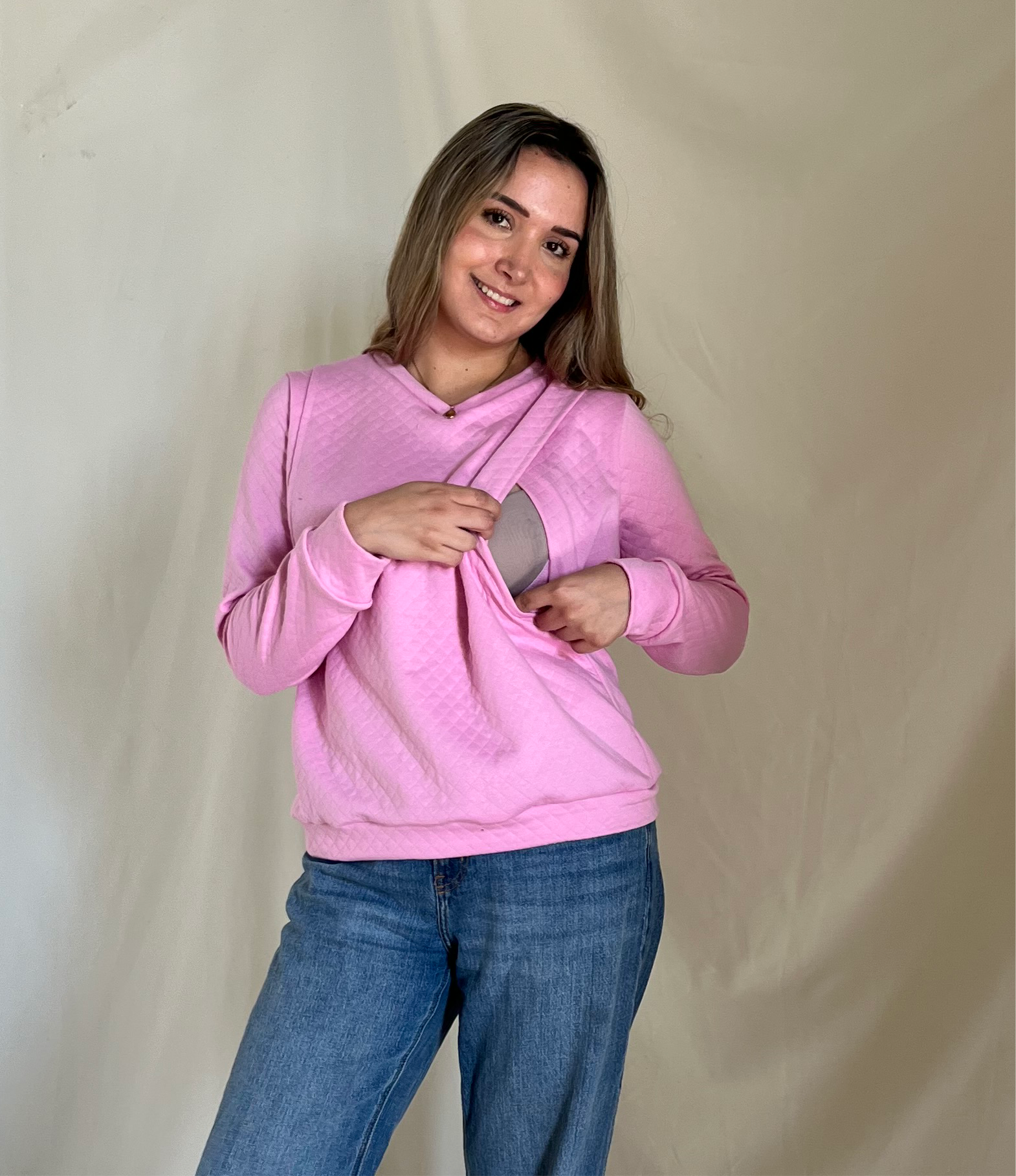 Sudadera de lactancia strech calientita, cuenta con dos aberturas a los costados en la zona del pecho para mover la tela fácilmente y amamantar a tu bebe.