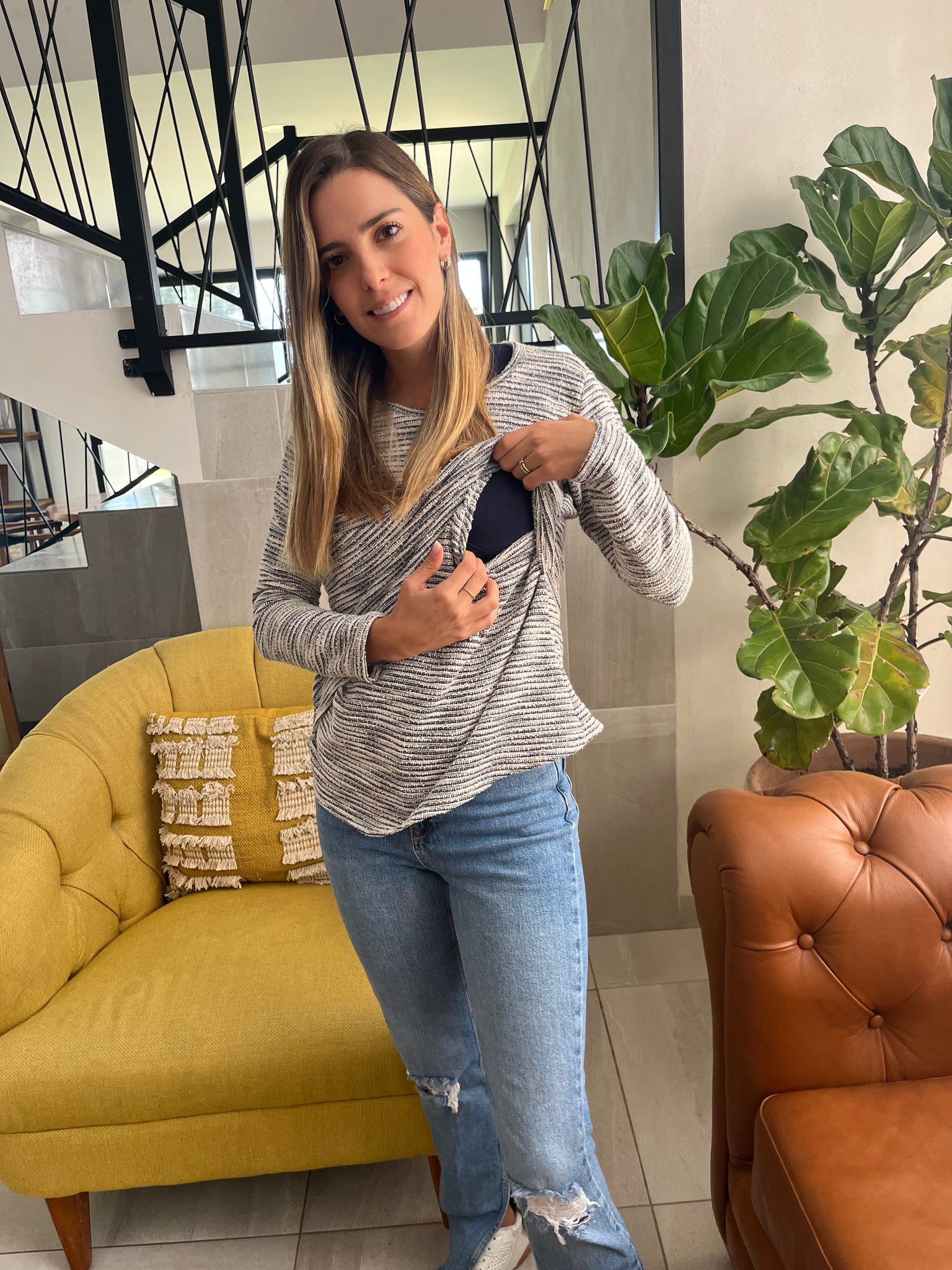 Suéter que cuenta con una abertura en la zona del frente, para mover la tela fácilmente y amamantar a tu bebé. Así la espalda no se enfriará y sin tener que utilizar manta de lactancia.