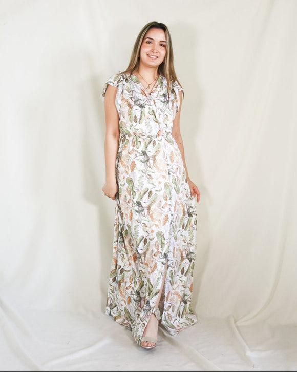 Vestido largo de manga corta, elaborado en tela ligera, cuenta con broche enmedio para poder amamantar.