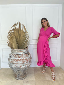 Vestido de mangas cortas elaborado en tela ligera y fresca, tiene un listón debajo del pecho para ajustarse al cuerpo.